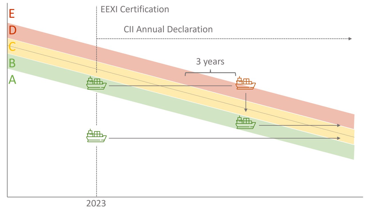 Ежегодно судно должно считать показатель и рейтинг CII на основе, грубо говоря, потребленного топлива и пройденного расстояния. Если рейтинг А, В или С, то норм. Если D и E, то начинаются проблемы, пока небольшие, но в перспективе может быть вплоть до ограничений в эксплуатации. Именно сейчас завершаются необходимые формальности, и на суда выдаются документы, подтверждающие первый ежегодный рейтинг CII за 2023 год.